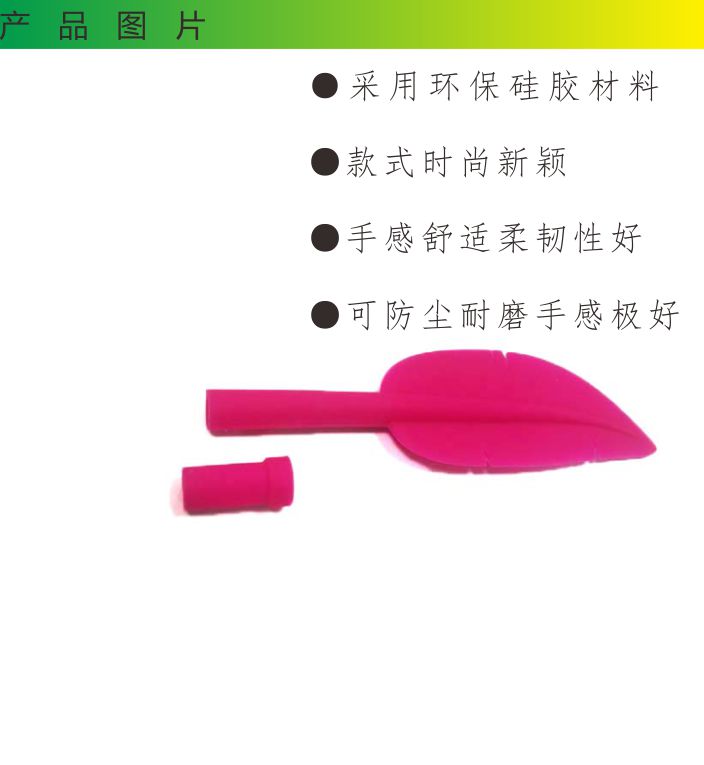 13712483599羽毛形狀硅膠筆套,是硅膠制品中的一種,由東莞帝博硅膠制品廠家創(chuàng)意研發(fā),在筆套內(nèi)套上直徑為6cm左右大的筆芯即可使用,材料選用環(huán)保硅膠高溫成型,無(wú)毒無(wú)味,產(chǎn)品柔軟有彈性,而且非常的有手感,書(shū)寫(xiě)更華麗。適合很多場(chǎng)合使用,搭配鮮艷的顏色更是讓這款產(chǎn)品如虎添翼,找不出一點(diǎn)瑕疵。