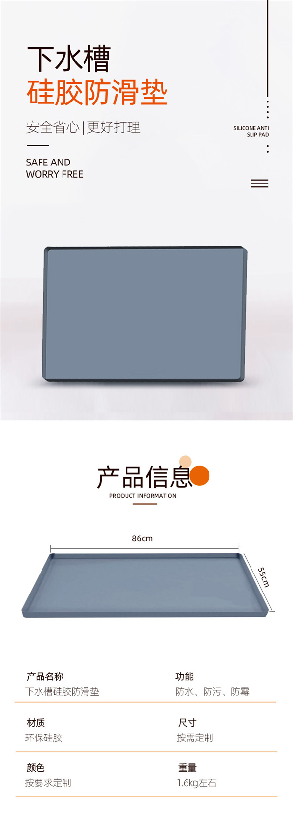 【產(chǎn)品功能】:廚衛(wèi)防滑防水功能,可用于家庭廚衛(wèi)下水槽防水,物品存放,產(chǎn)品防滑等功能