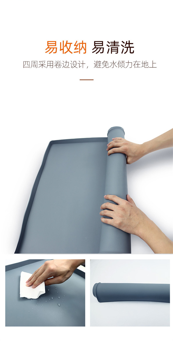硅膠水槽墊可以在多個不同環(huán)境情況下正常使用,產(chǎn)品不僅可以用于下水槽隔水使用,也可以用于家居防滑腳墊以及廚房洗手臺物品收納擺放作用,硅膠材質特性特殊,具備一定的防滑效果和隔熱功能,外圍一圈為擋墻,可以戶外進行物品擺放以及高低溫存放,便于收納以及折疊攜帶等